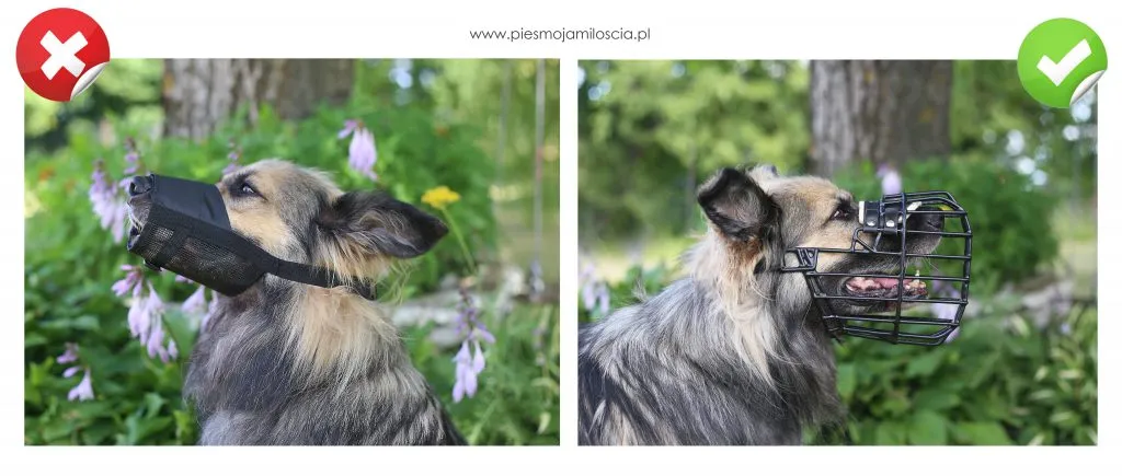 - Pies może swobodnie otworzyć pysk, ziajać i dyszeć.